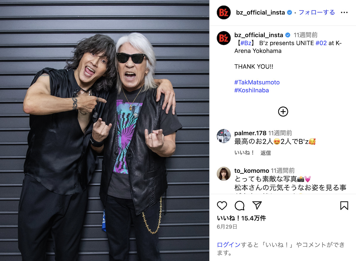 出典 Real Sound B’z、デビュー37周年 個々の活躍、ドームツアー、様々な競演……還暦を超えてもなお衰えることのない情熱