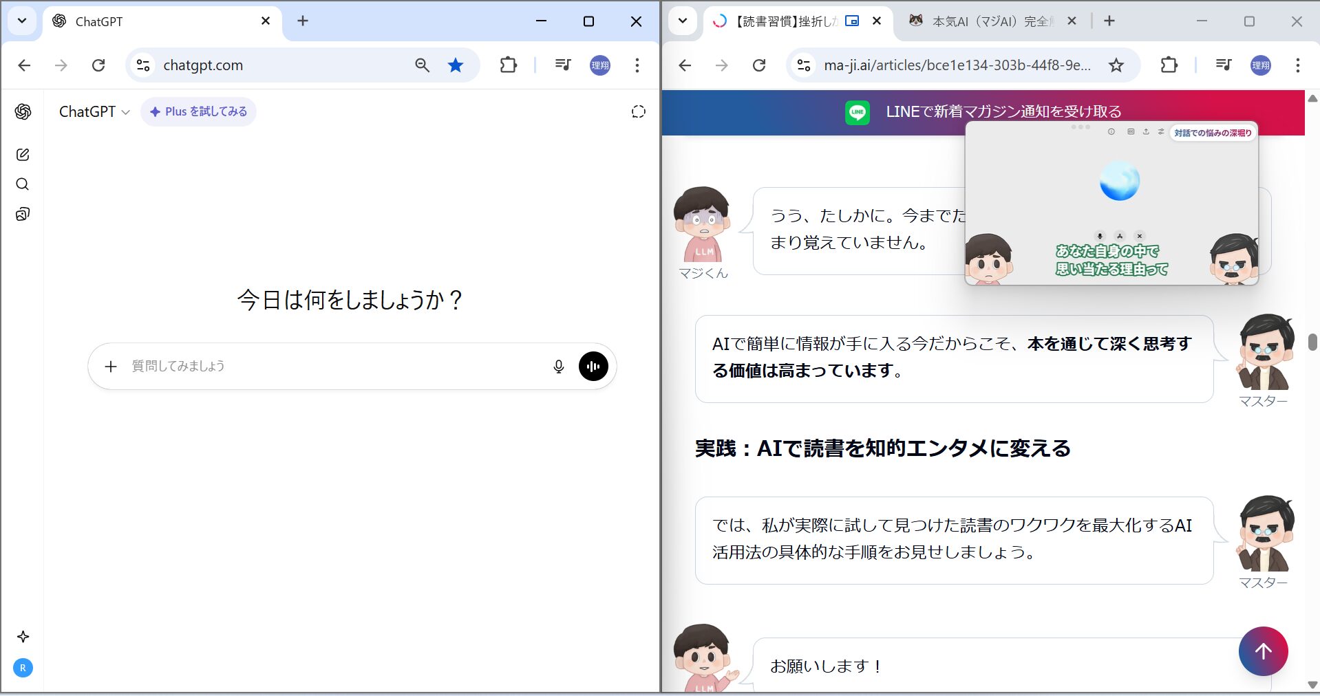 - 画面の左にChatGPTやClaude、メモ帳、右に本気AIのテキストを並べて作業
