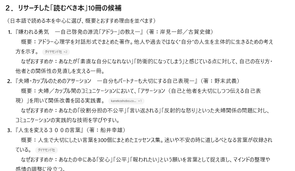 - ChatGPTで悩みを言語化→おすすめ本を提案→Claudeで“読みたくなる”プレゼンを作成