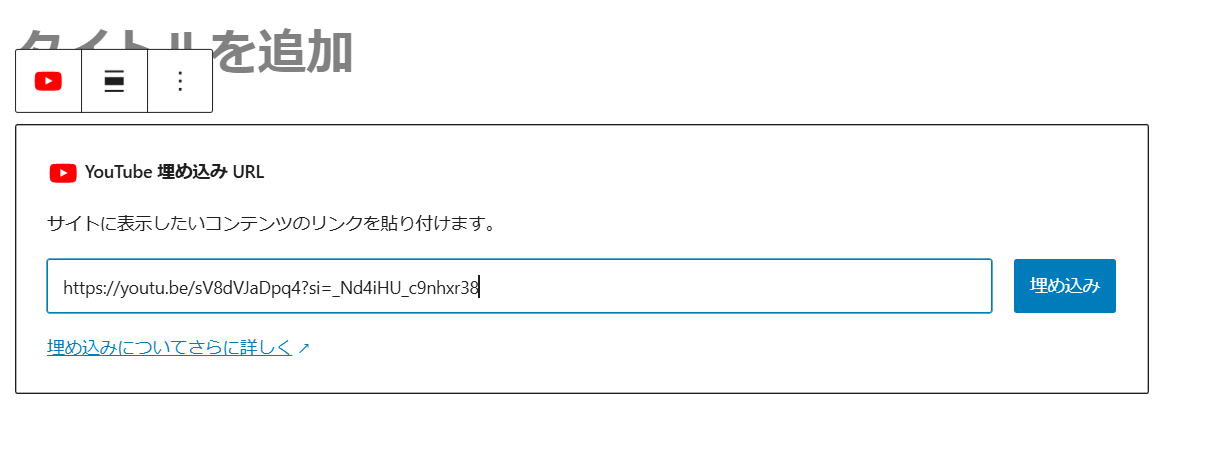 通常は「YouTube埋め込み」ブロックにURLを入力するだけで表示されるはずです。
